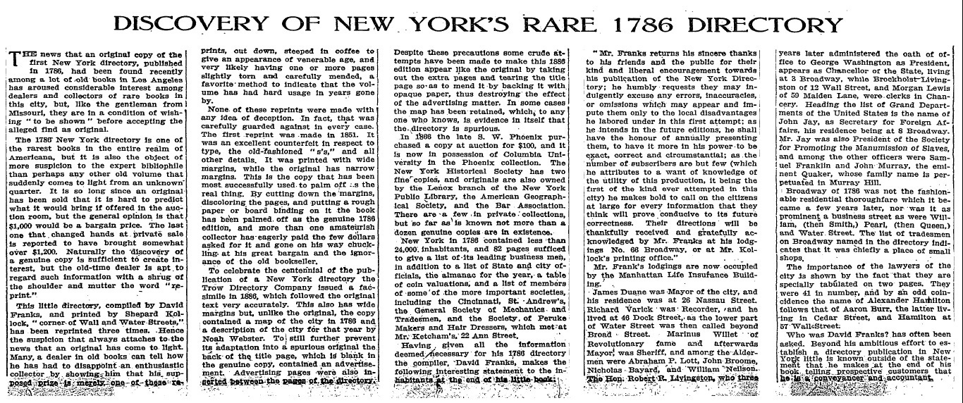 The news that an original copy of the first New York directory, published in 1786, had been found recently among a lot of old books in Los Angeles has aroused considerable interest among dealers and colectors of rare books in this city, but, like the gentleman from Missouri, they are in a condition of wishing "to be shown" before accepting the alleged find as original.