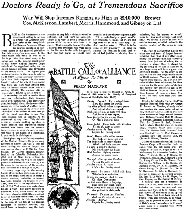 In answering the call to service these men are volunteering their incomes along with themselves... The highest pay available for members of the Medical Reserve Corps as army surgeons is $3,000, and this is only for those holding the rank of Major; the sum ranges down to $1,500 for Lieutenants. Dr. George Emerson Brewer, head of the Columbia University Hospital unit of New York, ordered to France last week, has one of the largest professional incomes in the country; with his going to the service of his country that is reduced to a salary of $3,000.