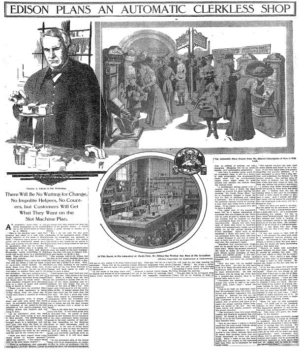 EDISON PLANS AN AUTOMATIC CLERKLESS SHOP: There Will Be No Waiting for Change, No Impolite Helpers, No Counters, but Customers Will Get What They Want on the Slot Machine Plan (PDF)