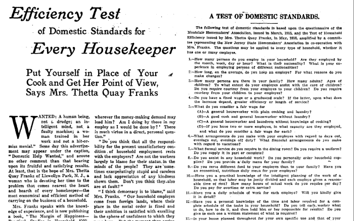 There was a discrepancy of 60,000 more housekeeper jobs than people to fill the positions, as of 1917, because many women found the position undesirable. Thetta Quay Franks, author of the book The Margin of Happiness: Practical Studies in Household Efficiency, came up with a series of questions for the head of the household to ask their housekeeper, to ensure the housekeeper was happy and comfortable in their employment. Among them were questions related to fair wages, vacation time, whether the female head of the household assisted with the work, whether a daily schedule of work as provided, and whether employees received different food than the family.