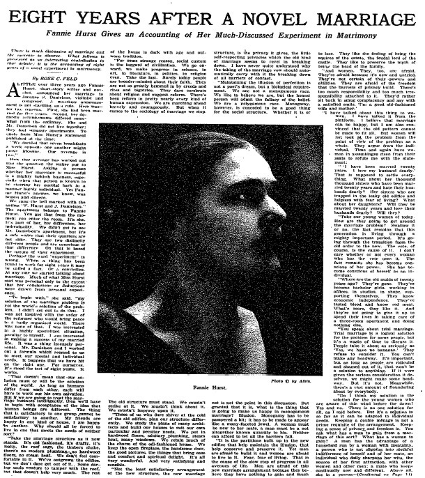 In a 1923 New York Times Magazine interview, novelist and short story writer Fannie Hurst described how her current (and second) marriage reflected this bold new era of women's suffrage and independence.