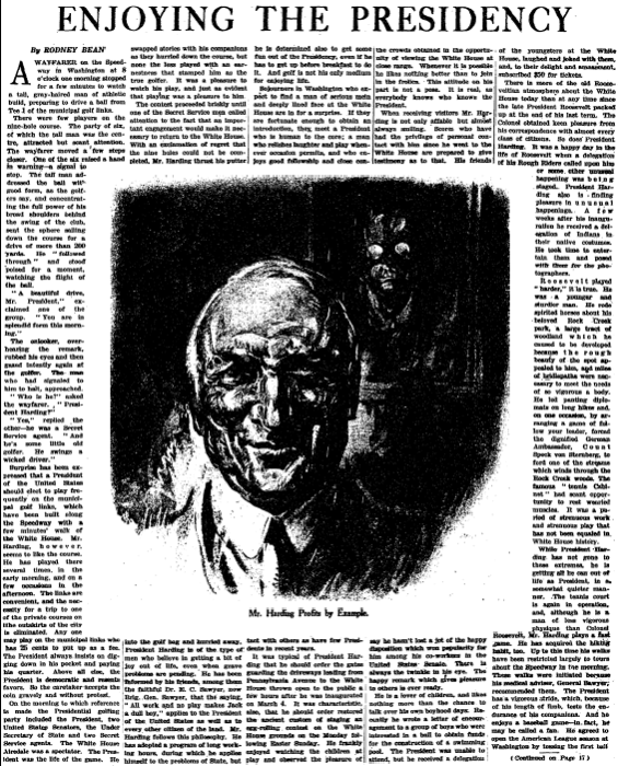 And [Harding] enjoys a baseball game -- in fact, he may be called a fan. He agreed to open the American League season at Washington by tossing the first ball out upon the diamond, not solely because it was a thing which he was expected to do, but because he wanted to have a good time at the game. He even kept a box score, following each play and joining in the applause. He didn't just hurry to the ball park, look on for a few minutes, and then hurry away. He stayed to the bitter end.