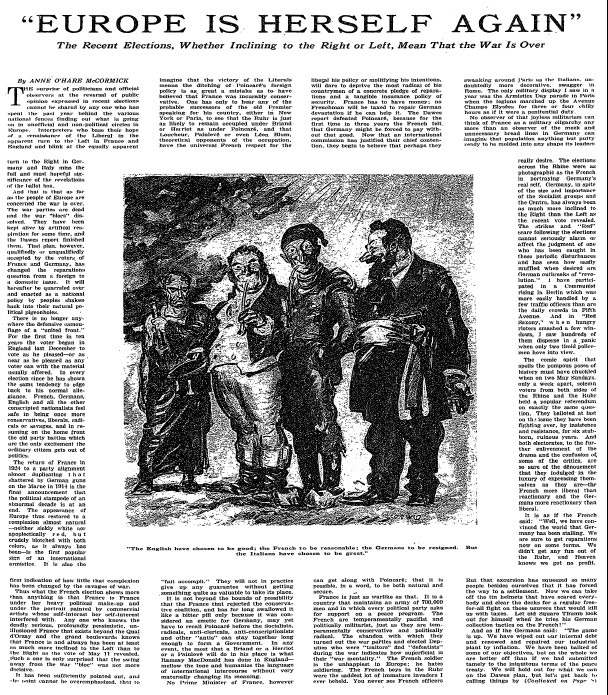 In a June 1924 New York Times Magazine article, Anne O'Hare McCormick declared that several years after World War I, European politics had returned to normal. A decade and a half later, the continent was engulfed in World War II.