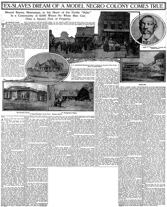 EX-SLAVES DREAM OF A MODEL NEGRO COLONY COMES TRUE: Mound Bayou, Mississippi, in the Heart of the Fertile "Delta" Is a Community of 8,000 Where No White Man Can Own a Square Foot of Property (PDF)