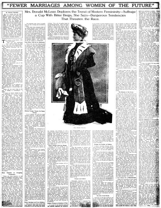 FEWER MARRIAGES AMONG WOMEN OF THE FUTURE: Mrs. Donald McLean Deplores the Trend of Modern Femininity -- Suffrage a Cup With Bitter Dregs, She Says -- Dangerous Tendencies That Threaten the Race (PDF)