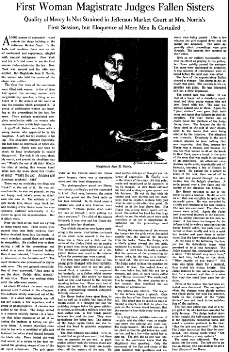First Woman Magistrate Judges Fallen Sisters: Quality of Mercy Is Not Strained in Jefferson Market Court at Mrs. Norris's First Session, but Eloquence of Mere Men Is Curtailed