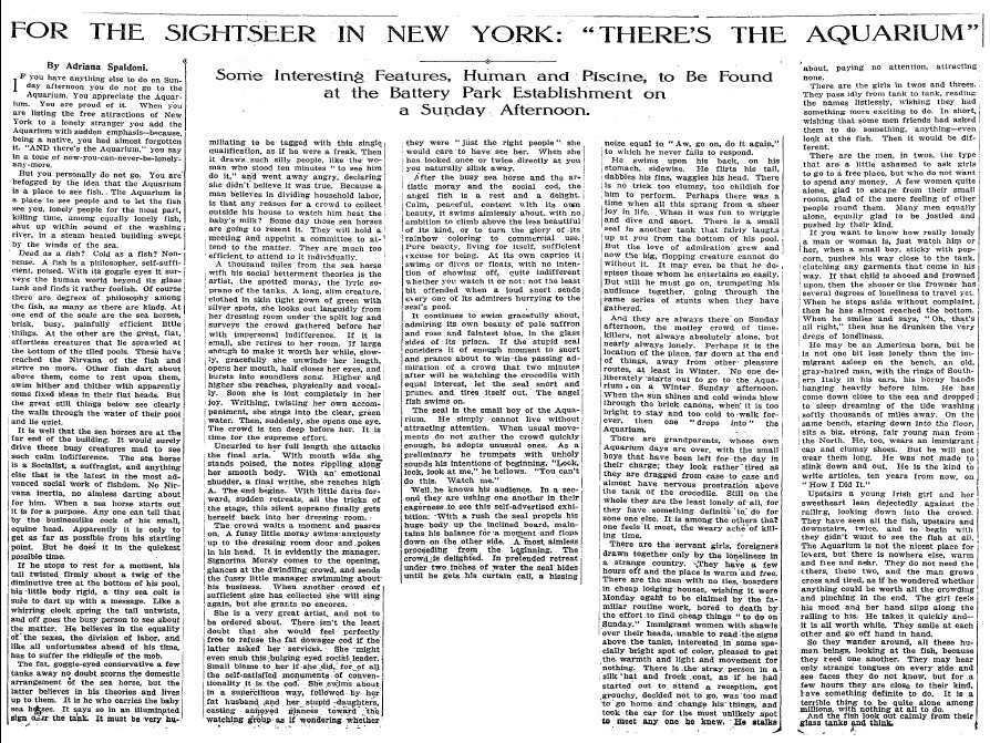 FOR THE SIGHTSEER IN NEW YORK: "THERE'S THE AQUARIUM": Some Interesting Features, Human and Piscine, to Be Found at the Battery Park Establishment on a Sunday Afternoon. (PDF)