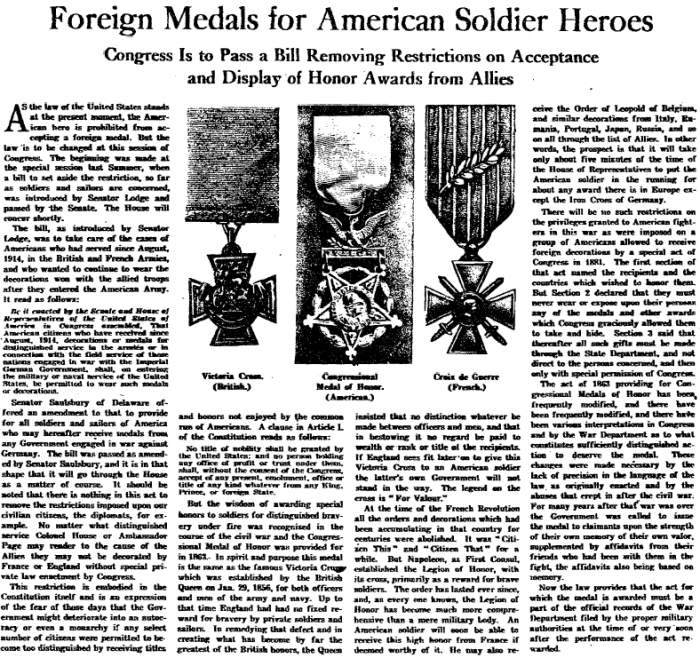 Under the bill, any American soldier would now be allowed to receive a foreign medal for their military service, such as the British Victoria Cross of the French Croix de Guerre.