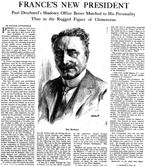 When Paul Deschanel was elected president of France in January 1920, this article predicted great things. Instead, his behavior proved so erratic that he resigned after seven months and entered a mental institution.