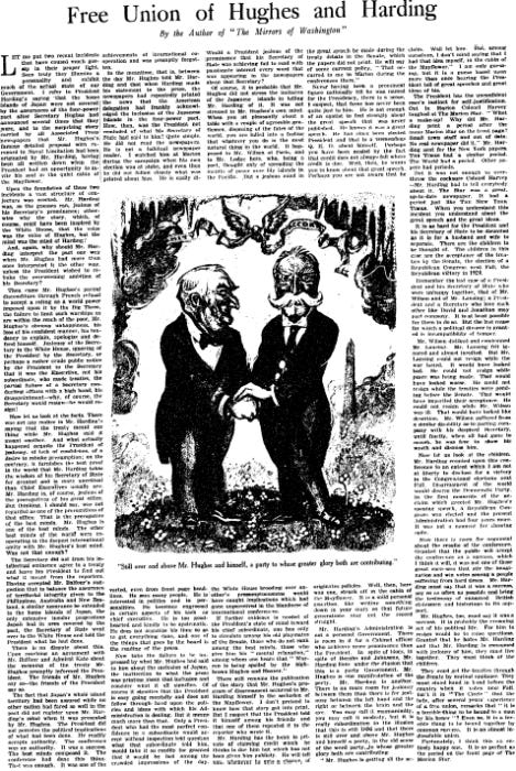 Mr. Harding's administration is not a personal government. There is room in it for a Cabinet officer who achieves more prominence than the president... They must get the treaties through the Senate by mutual applause. They must stand hand in hand before the country when it votes next fall.