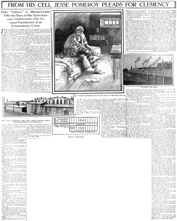 FROM HIS CELL JESSE POMEROY PLEADS FOR CLEMENCY: Only "Solitary" in Massachusetts Tells the Story of His Thirty-four-year Confinement -- The Unusual Punishment of an Extraordinary Crime. (PDF)