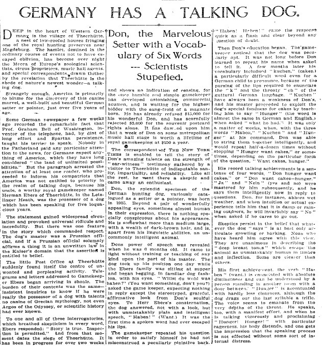 Don's power of speech was revealed when he was 6 months old. It came to light without training or teaching of any kind upon the part of his master. The dog took up his position one day while the Ebers family was sitting at supper and began begging, in familiar dog fashion, with his eyes. "Willst du wohl was haben?" (You want something, don't you?) asked the game keeper, expecting nothing in reply except the stereotyped, grateful, affirmative look from Don's soulful eyes. To Herr Eber's consternation, the dog answered, not with a look, but with unmistakably plain and intelligent speech, "Haben!" (Want.) It was the first time a spoken word have ever escaped his lips.