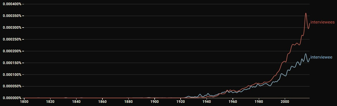 Another interesting finding from that graph: the singular word interviewee and plural form interviewees always ran approximately equal in frequency from the 1920s through 1980s, until the 1990s when the plural interviewees began to break away.