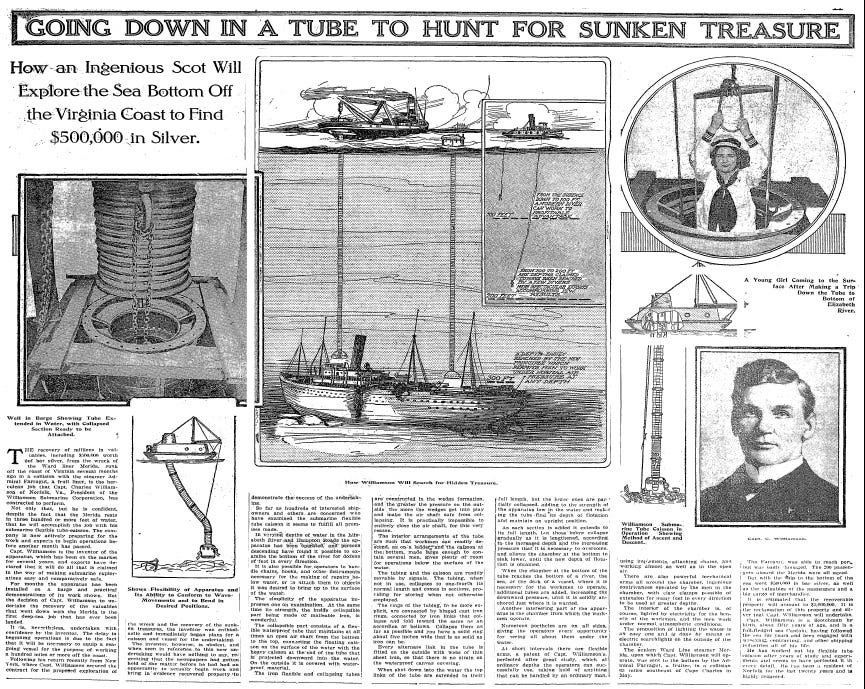 GOING DOWN IN A TUBE TO HUNT FOR SUNKEN TREASURE: How an Ingenious Scot Will Explore the Sea Bottom Off the Virginia Coast to Find $500,000 in Silver. (PDF)