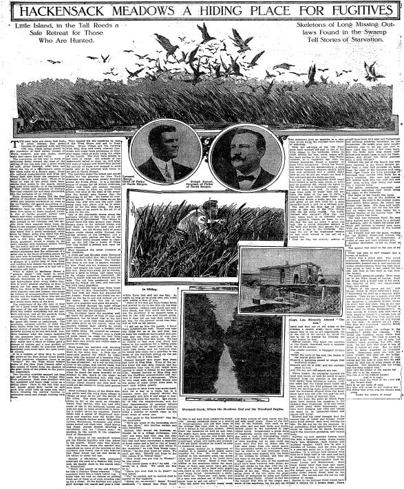 The Meadowlands District of Northeastern New Jersey is known today as the home of the Meadowlands Sports Complex. But in 1910, the area's swampy marshes were a great hiding place for fugitives: