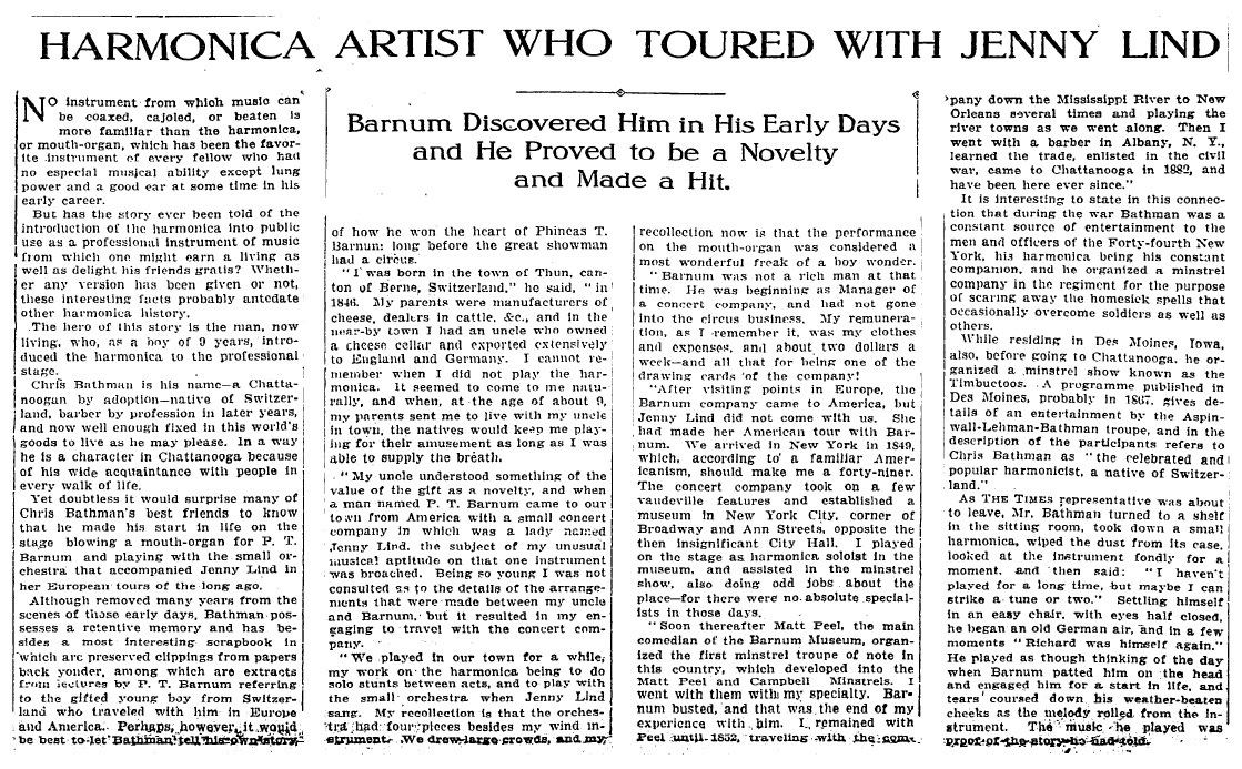 This article tells the story of Chris Bathman, who claims to have introduced the harmonica to the professional stage. I can't find any information about him outside of this article, but here is his story: