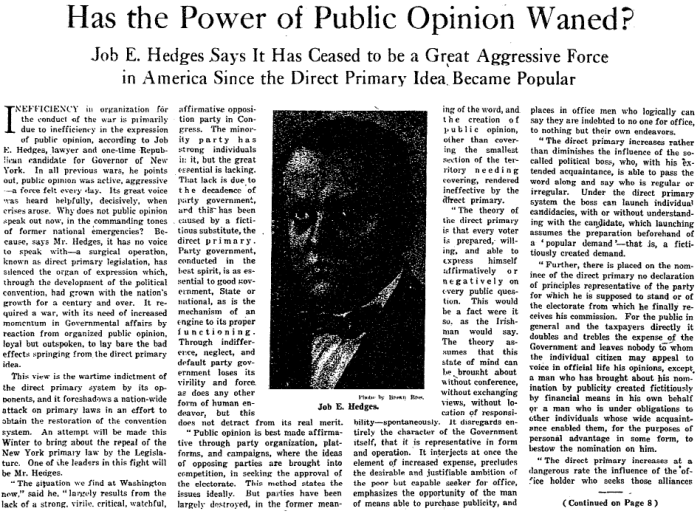 Was the power of public opinion on American politics declining in 1918? Job E. Hedges, former Republican candidate for New York governor, said yes and blamed it on political primaries:
