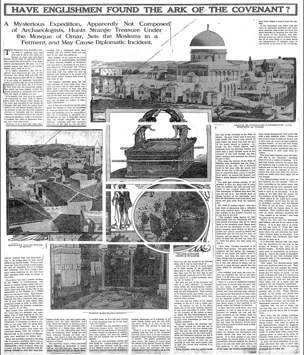 HAVE ENGLISHMEN FOUND THE ARK OF THE COVENANT? A Mysterious Expedition, Apparently Not Composed of Archaeologists, Hunts Strange Treasure Under the Mosque of Omar, Sets the Moslems in a Ferment, and May Cause Diplomatic Incident. (PDF)