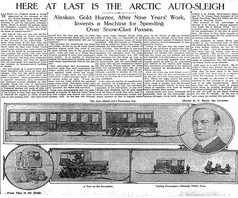 Inventor Charles E. S. Burch was one of the lucky few people who actually struck it rich in the northwestern Gold Rush of 1896. He spent nine years using his wealth to develop a vehicle to carry people across the snow, and finally came up with this design, using threaded wheels on the engine, and sled rails on the passenger car.