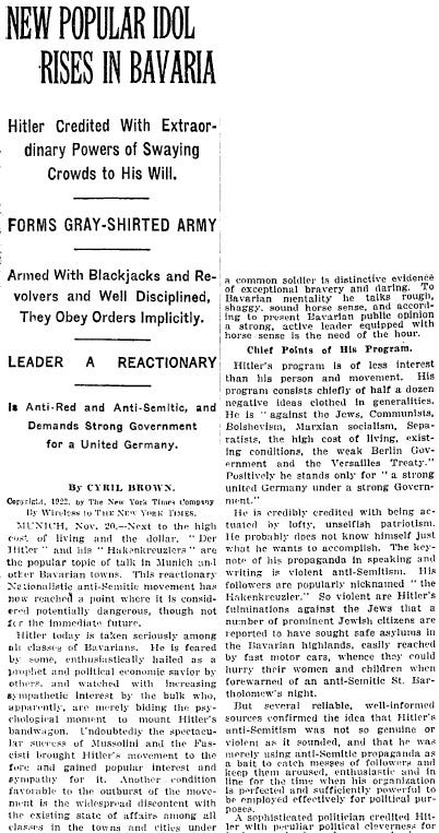 On Tuesday, November 21, 1922, the New York Times printed its first profile article of Adolf Hitler. It would not be the last.