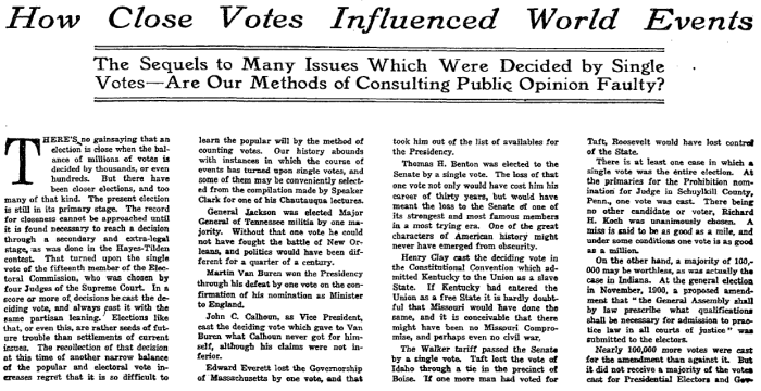 This article details several times that elections or ballot measures came down to one vote, and the consequential results that followed. It's hard to know how many of these are fully true, but some of them are rather startling. Take this one, which was certainly never taught in any history class I ever attended: