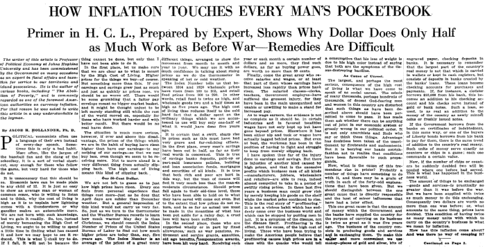 What was the primary cause of huge inflation from 1915 to 1920? According to Johns Hopkins political economy professor Jacob Hollander in this article from the time, the primary cause was quantitative easing: