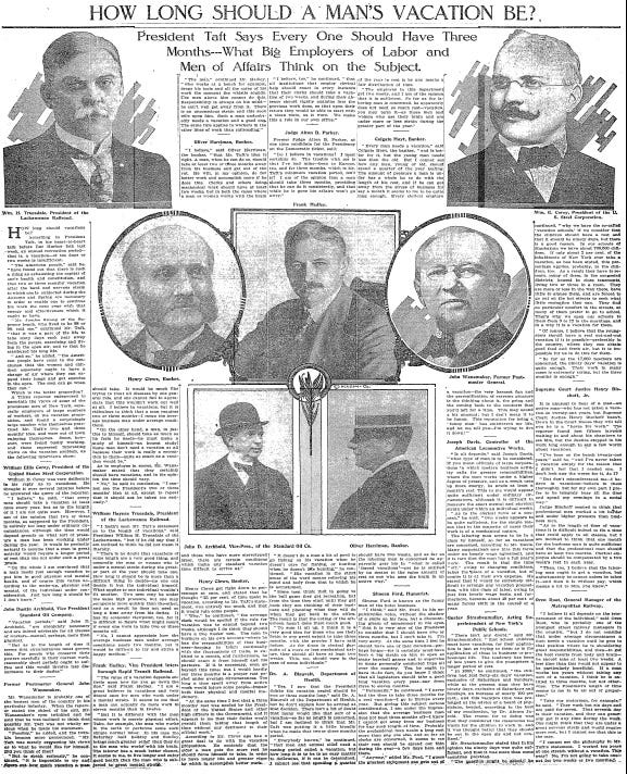 HOW LONG SHOULD A MAN'S VACATION BE? President Taft Says Every One Should Have Three Months -- What Big Employers of Labor and Men of Affairs Think on the Subject. (PDF)