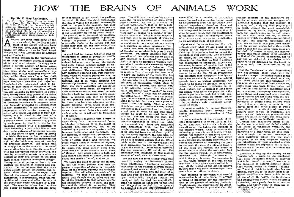 Here, he has selected excerpts from the entry for The Intelligence of Animals. Since the 1911 edition of the encyclopedia is now public domain, you can read the full entry as it originally appeared in print. And for comparison, here is the Wikipedia entry on Animal Intelligence.