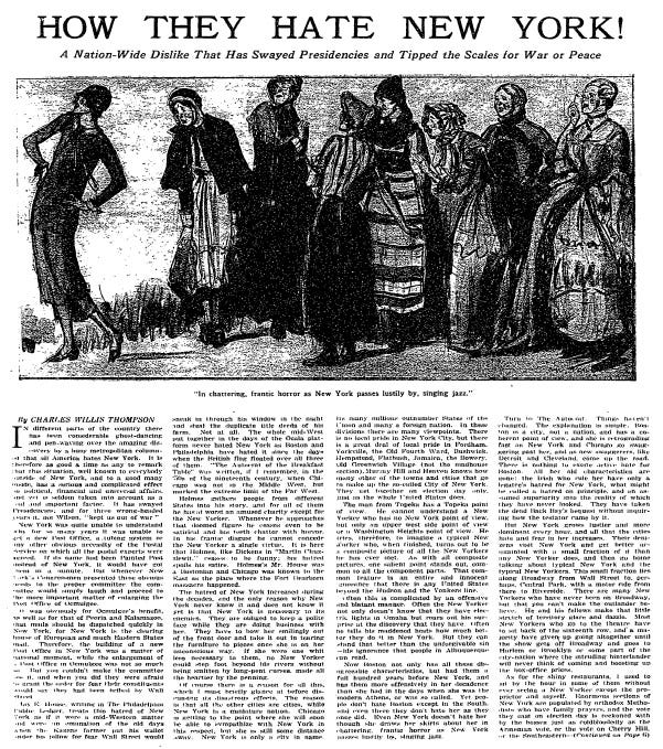 According to a 1923 New York Times Magazine article, everybody at the time hated New York City. The writer, Charles Willis Thompson, declared "this situation well known to everybody outside of New York, and to a good many inside."