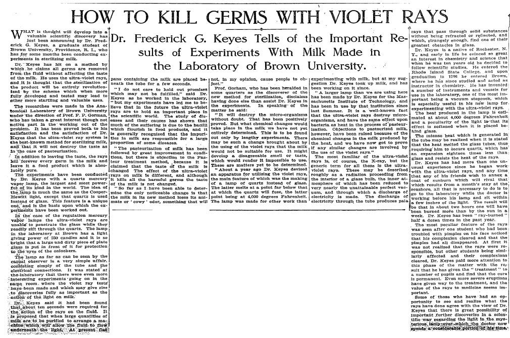 HOW TO KILL GERMS WITH VIOLET RAYS: Dr. Frederick G. Keyes Tells of the Important Results of Experiments With Milk Made in the Laboratory of Brown University (PDF)