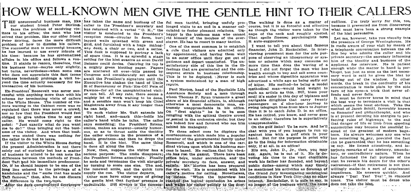 If you are dreading your company holiday party because those dweebs from accounting will chat you up all night, read this article for tips from some of history's famous brushers-off, including Presidents Roosevelt and Taft, and J. D. Rockefeller.