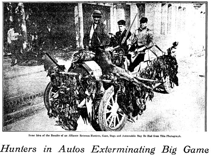 The relatively new invention of the automobile was producing unforeseen consequences for hunters. William T. Hornaday, director of the New York Zoological Park, thought that lawmakers should ban the practice: