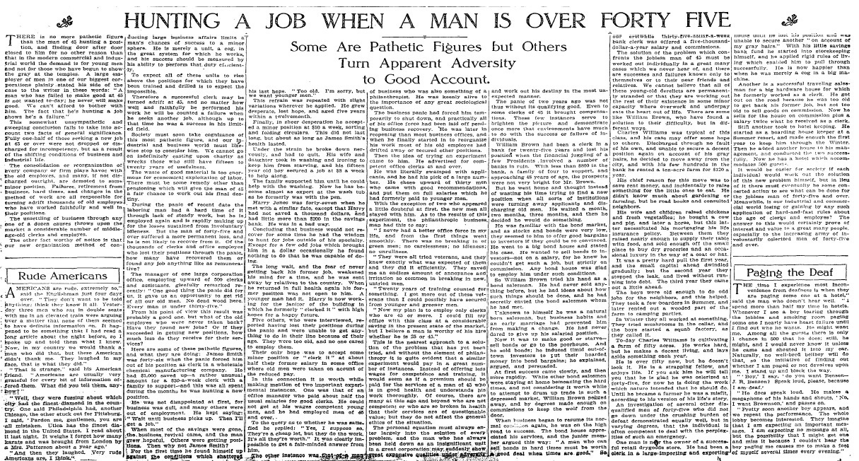 HUNTING A JOB WHEN A MAN IS OVER FORTY FIVE: Some Are Pathetic Figures but Others Turn Apparent Adversity to Good Account (PDF)