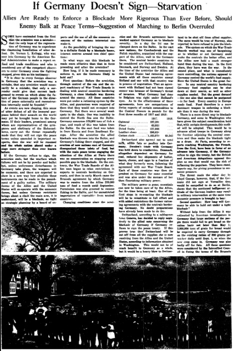 This article from the time described just how horrendous it would be for Germany if they didn't sign the Treaty of Versailles, with the operative word in the headline being "starvation." As it happened, Germany would indeed sign the treaty mere weeks later.