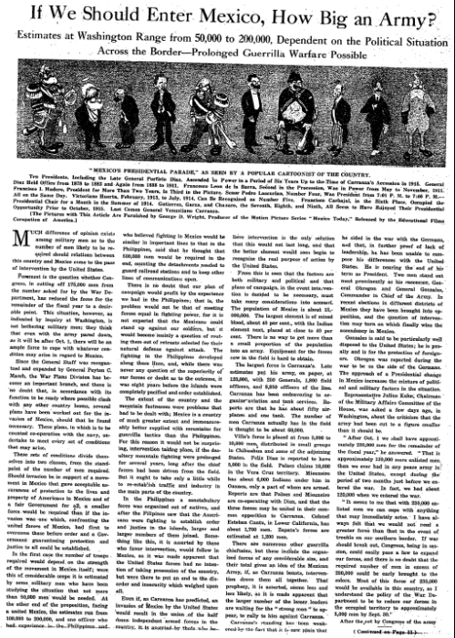 If We Should Enter Mexico, How Big an Army?: Estimates at Washington Range from 50,000 to 200,000, Dependent on the Political Situation Across the Border -- Prolonged Guerrilla Warfare Possible