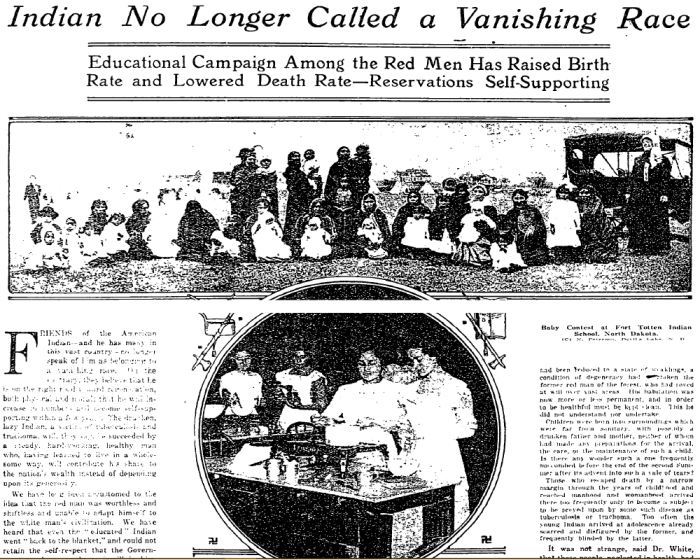 According to the 1916 article, the improvements in Native American birth rate and health came about over the previous three years in large part due to the health education campaign of Cato Sells, Commissioner of the Bureau of Indian Affairs from 1913-1921, which today is an agency housed within the U.S. Department of the Interior.