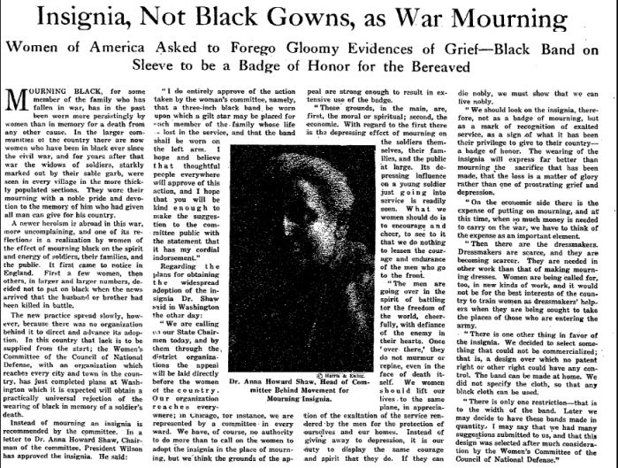 Insignia, Not Black Gowns, as War Mourning: Women of America Asked to Forego Gloomy Evidences of Grief -- Black Band on Sleeve to be a Badge of Honor for the Bereaved