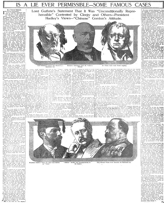 IS A LIE EVER PERMISSIBLE -- SOME FAMOUS CASES: Lord Guthrie's Statement That It Was "Unconditionally Reprehensible" Contested by Clergy and Others -- President Hadley's Views -- "Chinese" Gordon's Attitude. (PDF)