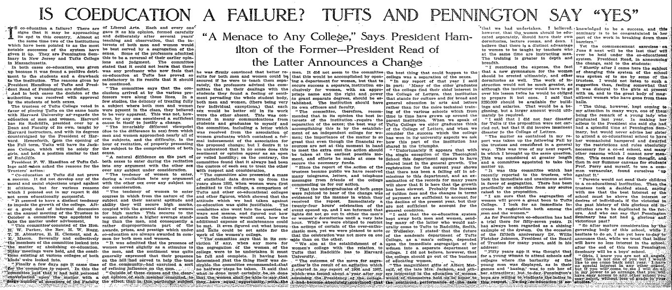 IS COEDUCATION A FAILURE? TUFTS AND PENNINGTON SAY "YES": "A Menace to Any College," Says President Hamilton of the Former -- President Read of the Latter Announces a Change (PDF)