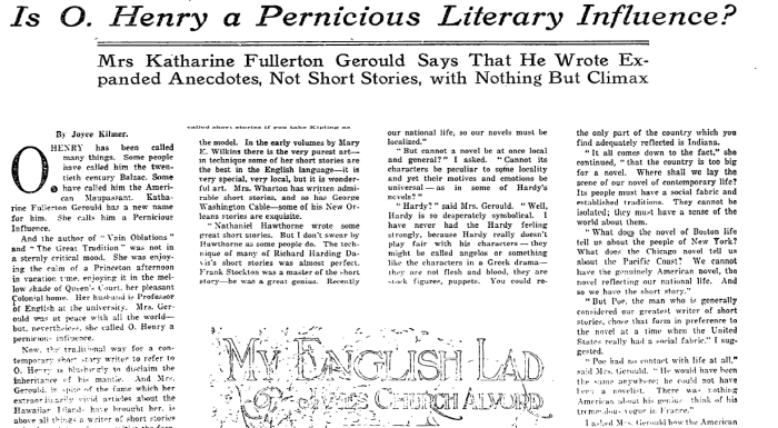 Is O. Henry a Pernicious Literary Influence?: Mrs. Katharine Fullerton Gerould Says That He Wrote Expanded Anecdotes, Not Short Stories, with Nothing But Climax
