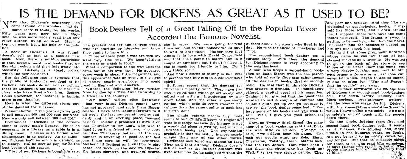 IS THE DEMAND FOR DICKENS AS GREAT AS IT USED TO BE? Book Dealers Tell of a Great Falling Off in the Popular Favor Accorded the Famous Novelist. (PDF)