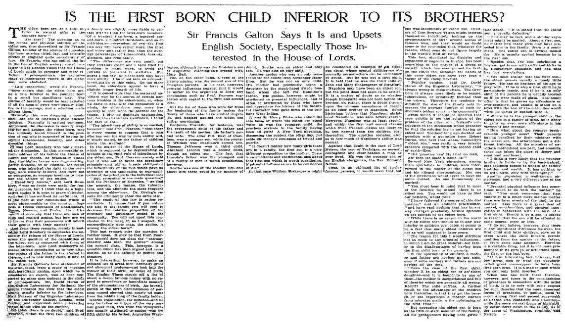 IS THE FIRST BORN CHILD INFERIOR TO ITS BROTHERS? Sir Francis Galton Says It Is and Upsets English Society (PDF)