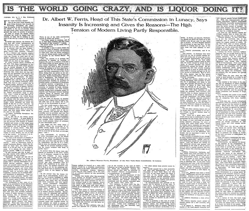 IS THE WORLD GOING CRAZY, AND IS LIQUOR DOING IT? Dr. Albert W. Ferris, Head of This State's Commission in Lunacy, Says Insanity Is Increasing and Gives the Reasons -- The High Tension of Modern Living Partly Responsible. (PDF)