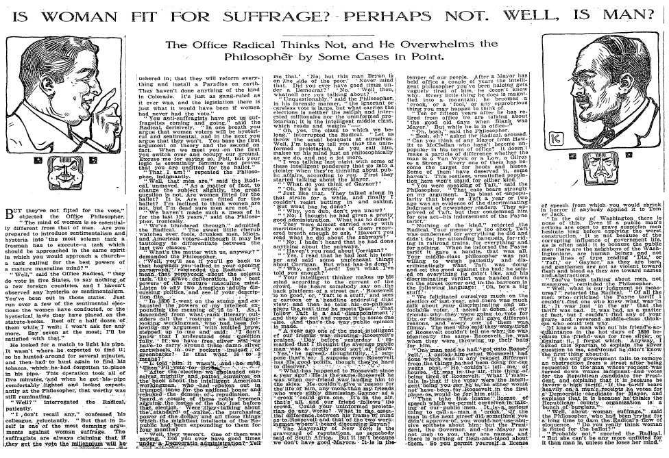 The Office Radical and the Office Philosopher were two otherwise unidentified debaters who took on various topics in the Sunday Magazine. I've posted one of their debates here before. This one is about suffrage.