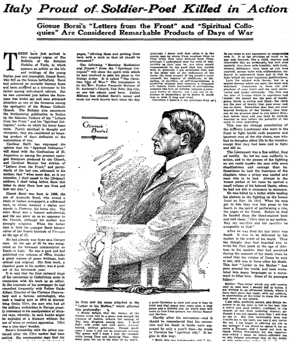 Italy Proud of Soldier-Poet Killed in Action: Giosue Borsi's "Letters from the Front" and "Spiritual Colloquies" Are Considered Remarkable Products of Days of War
