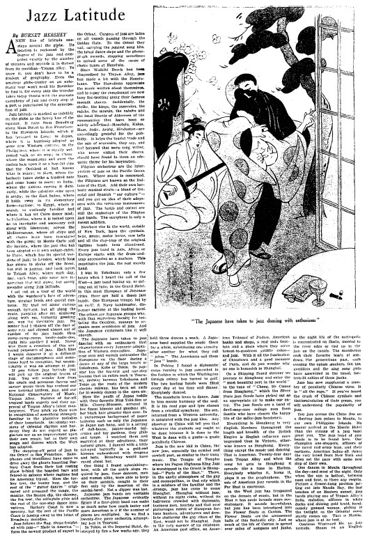 Jazz latitude is marked as indelibly on the globe as the heavy line of the equator. It runs from Broadway along Main Street to San Francisco: to the Hawaiian Islands, which it has lyricized to fame; to Japan, where it is hurriedly adopted as some new Western culture; to the Philippines, where it is royally welcomed back as its own; to China where the mandarins and even the coolies look upon it as a helpful sign that the Occident [an antonym of "the Orient"] at last knows what is music; to Siam [modern-day Thailand], where the barbaric tunes strike a kindred note and come home to roost; to India, where the natives receive it dubiously, while the colonists seize upon it avidly; to the East Indies, where it holds sway in its elementary form -- ragtime; to Egypt, where it sounds so curiously familiar and where it has set Cairo dance mad; to Palestine, where it is looked upon as an inevitable and necessary evil along with liberation; across the Mediterranean, where all ships and all shores have been inoculated with the germ; to Monte Carlo and the Riviera, where the jazz idea has been adopted as its own enfant-chéri [a term meaning "something that is highly favored"]; to Paris, which has its special versions of jazz; to London, which long has sworn to shake off the fever, but still is jazzing; and back again to Tinpan Alley, where each day, nay, each hour, adds some new inspiration that will slowly but surely meander along jazz latitude.