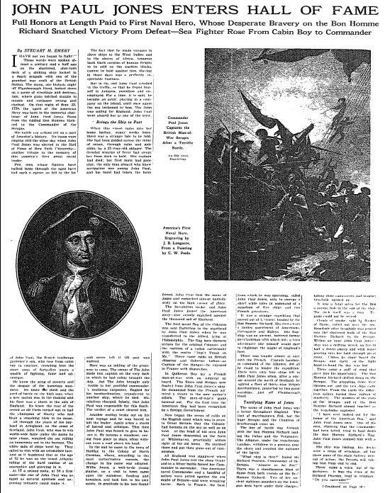John Paul Jones Enters Hall of Fame: Full Honors at Length Paid to First Naval Hero, Whose Desperate Bravery on the Bon Homme Richard Snatched Victory From Defeat – Sea Fighter Rose From Cabin Boy to Commander