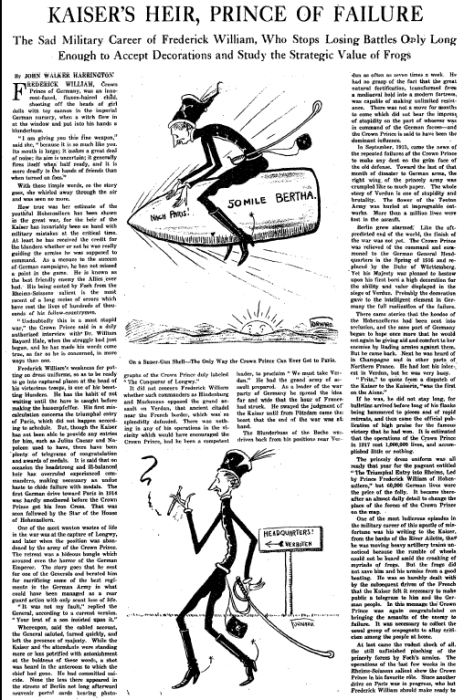 During WWI, he was one of the top military commanders despite being in his early 30's and never having previously commanded a military unit larger than a regiment. It... did not go well. This article, filled with ludicrous exaggerated drawings depicted the Crown Prince as a bumbling fool, describes the man: