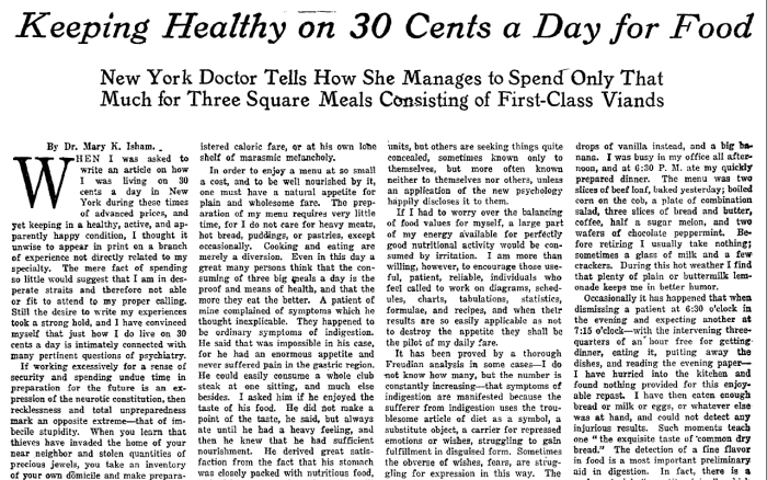 Keeping Healthy on 30 Cents a Day for Food: New York Doctor Tells How She Manages to Spend Only That Much for Three Square Meals Consisting of First-Class Viands