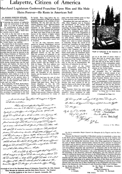 Lafayette, Citizen of America: Maryland Legislature Conferred Franchise Upon Him and His Male Heirs Forever -- He Rests in American Soil